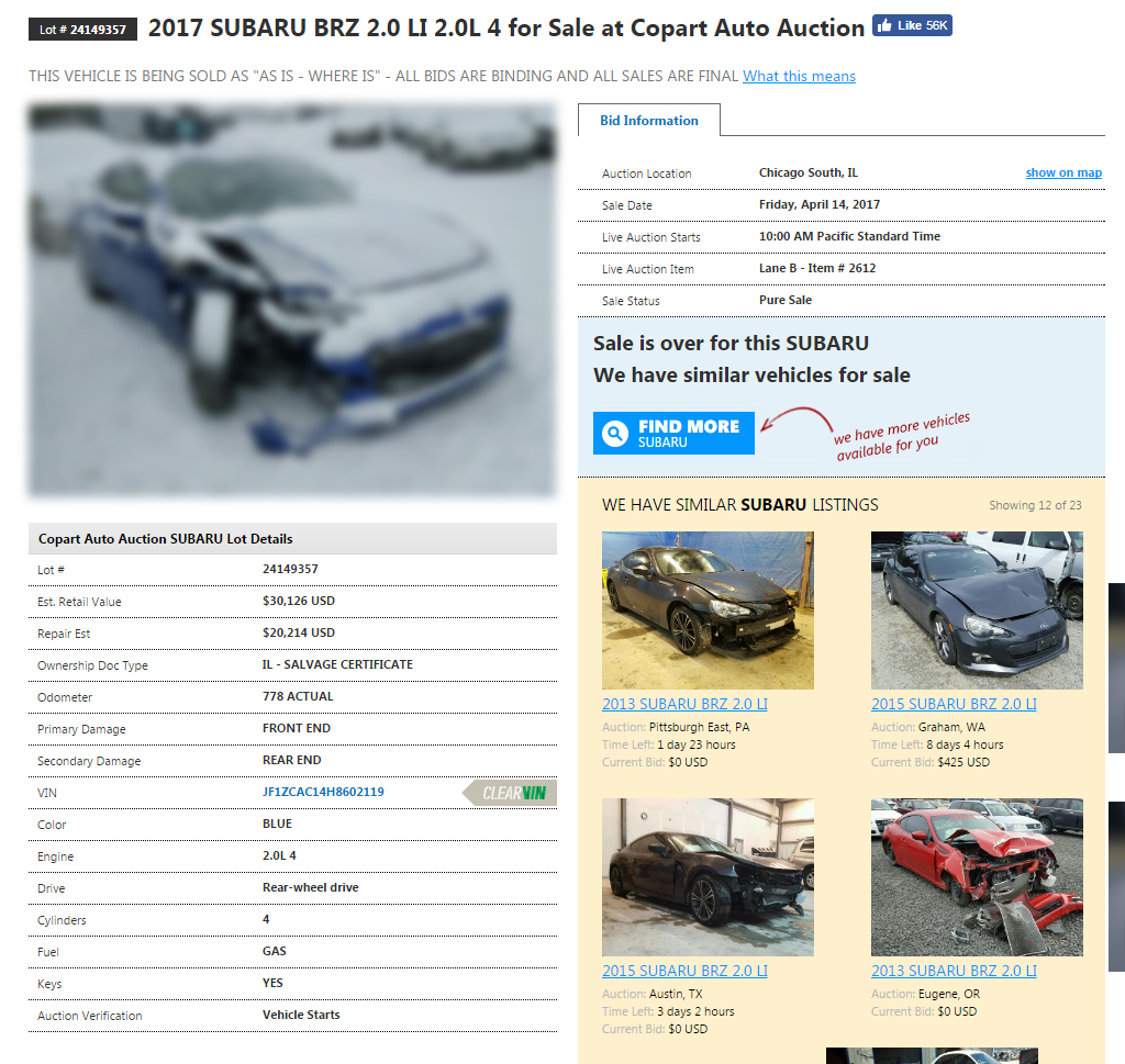TEMAT: SUBARU BRZ 2017 VIN: JF1ZCAC14H8602119