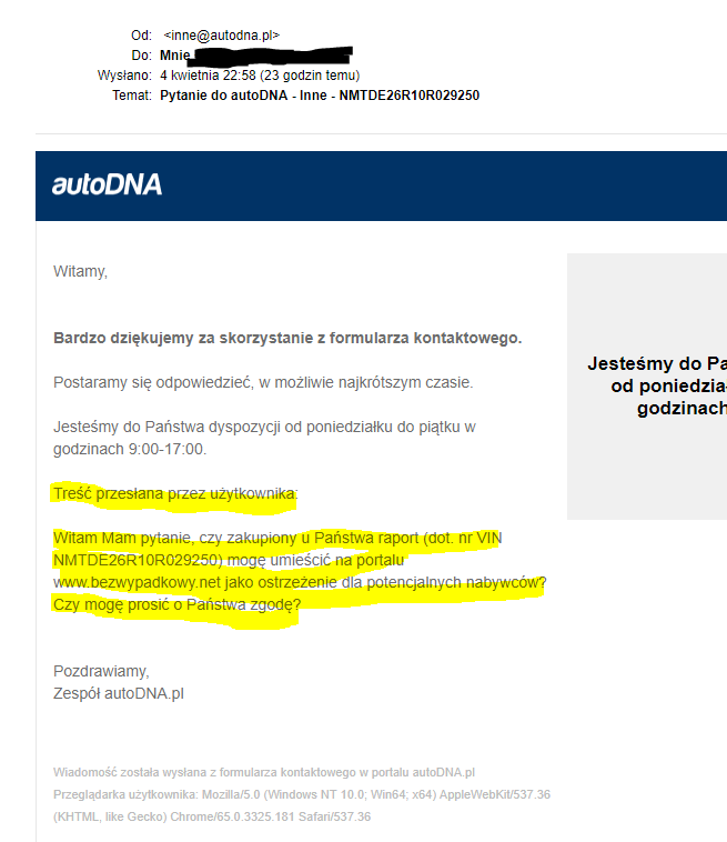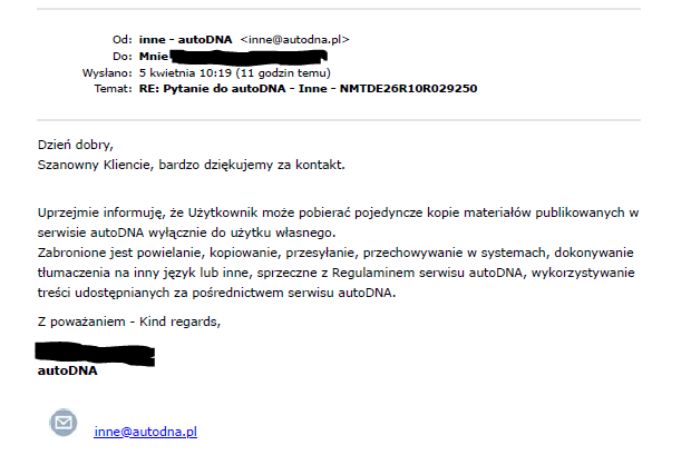 Panie Adminie, obiecałem że poproszę o zgodę firmę generującą dla mnie raport o umieszczenie go na tym portalu i tak jak obiecałem tak zrobiłem. W załączeniu przekazuję otrzymaną odpowiedź. Mam nadzieję, że dzięki lekturze w/w odpowiedzi nie będziesz już zachęcał ludzi do "reklamowania" publikowaniem raportów firm, które się tym zajmują i z tego się utrzymują. Jeżeli ktoś ma w poważaniu regulamin serwisu generującego raport/prawa autorskie i mimo wszystko opublikuje raport to jest tylko i wyłącznie jego wola ale i jego problem w przypadku ewentualnego egzekwowania swoich praw przez w/w firmy. Prawdę mówiąc nie zdziwiła mnie otrzymana od nich informacja, bo wyrażając zgodę odebrali by sobie potencjalnych klientów. Dlatego, jak ktoś po przeczytaniu mojego posta jednak zdecyduje się na odwiedziny sprzedawcy i nadal będzie miał wątpliwości, to myślę że sam taki raport może sobie zamówić, bo jego cena przy cenie jaką sprzedawca sobie życzy za auto jest znikoma.