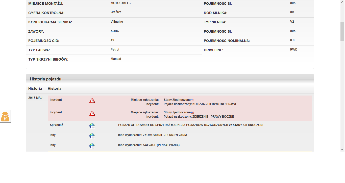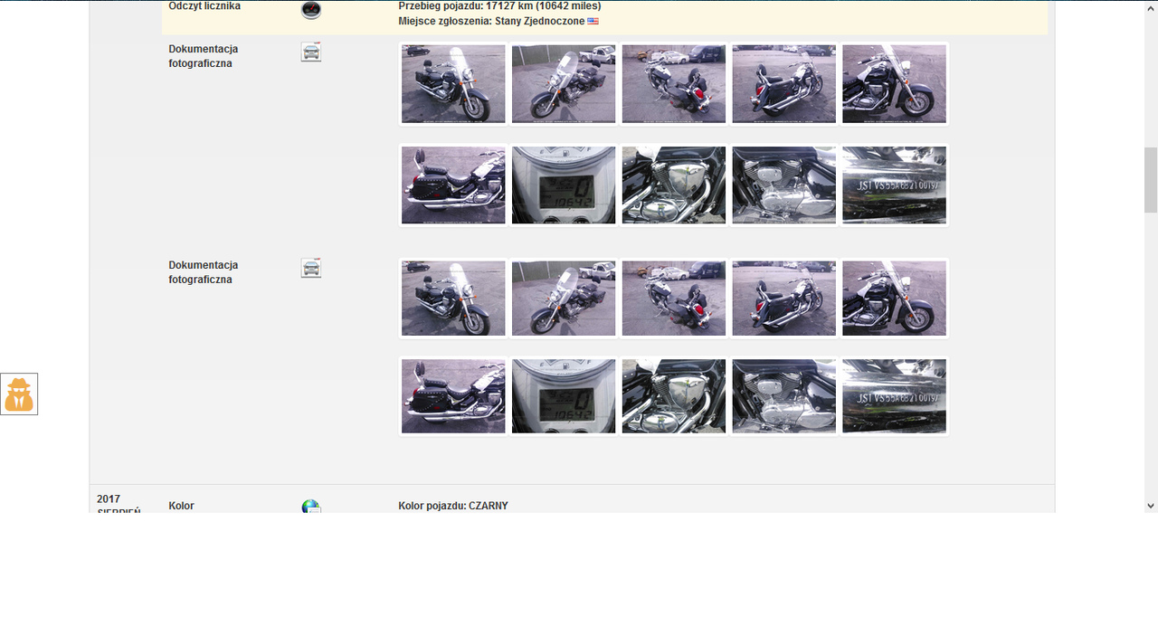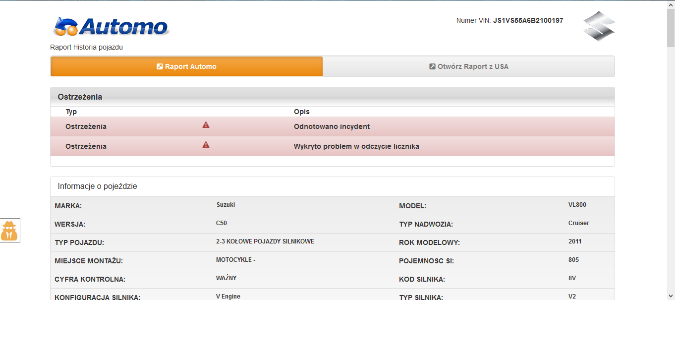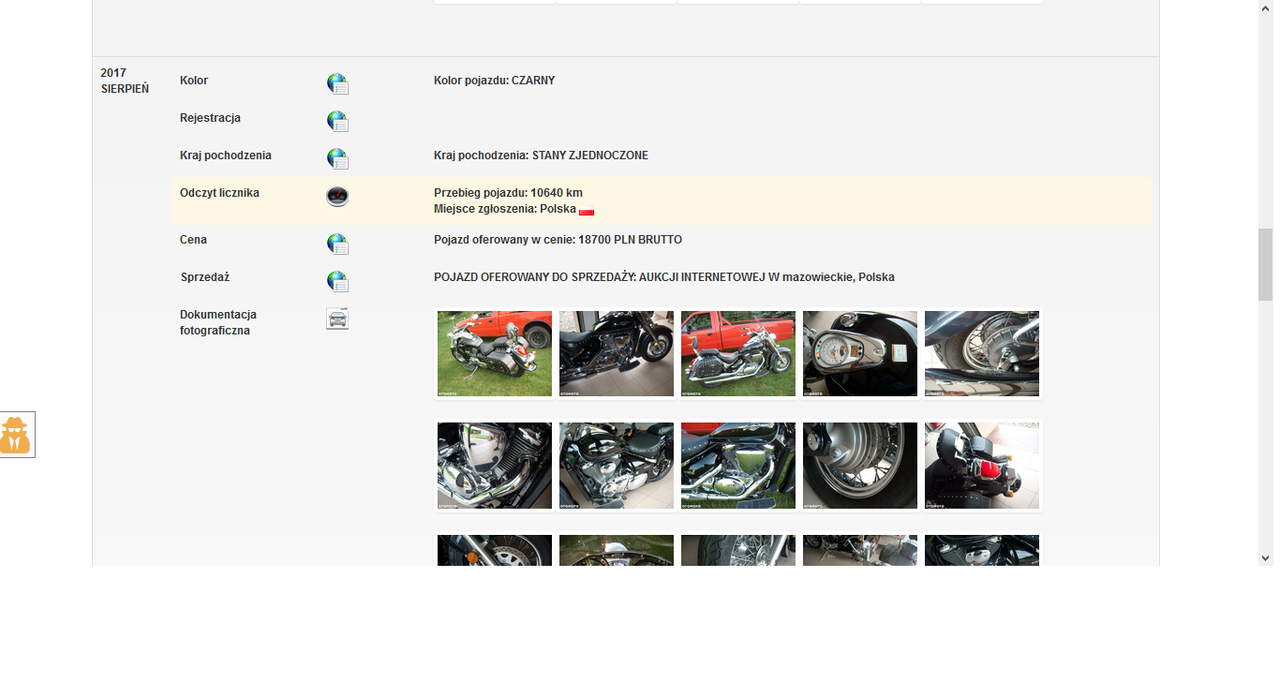 www.otomoto.pl/oferta/suzuki-bo ... BPHrD.html? postanowiłem kupić raport nr VIN JS1VS55A6B2100197 motocykla i ku mojemu zdziwieniu okazało się że osoba sprzedający motocykl nie jest pierwszym jego właścicielem w kraju jak twierdzi sprzedający w ogłoszeniu, gdyż został sprowadzony przez handlarza w województwie Mazowieckiem, który żądał za niego w sierpniu 2017 roku 18,700 zł i trafił docelowo do właściciela w miejscowości Mauryców woj. Łódzkie i chce go sprzedać za 20 tys zł. W ogłoszeniu właściciel nie wspomniał o tym iż w USA motocykl został uszkodzony i otrzymał status: ,, ZŁOMOWANIE - PENNSYLVANIA'', jak również wykryto problem w odczycie licznika. Motocykl ten nie powinien jeździć po naszych drogach,a w rozmowie telefonicznej byłem zapewniany o jego nienagannym stanie. Po odczycie nr VIN, napisałem do właściciela motocykla maila z żądaniem zamieszczenia informacji w ogłoszeniach na otomoto oraz olx o wypadkowej przeszłości motocykla i o cofnięciu licznika,moje żądanie zostało zignorowane,a nr VIN właściciel usunął z ogłoszenia, zatem zamieszczam ten post ku przestrodze dla innych motocyklistów,aby nie dali się nabrać.